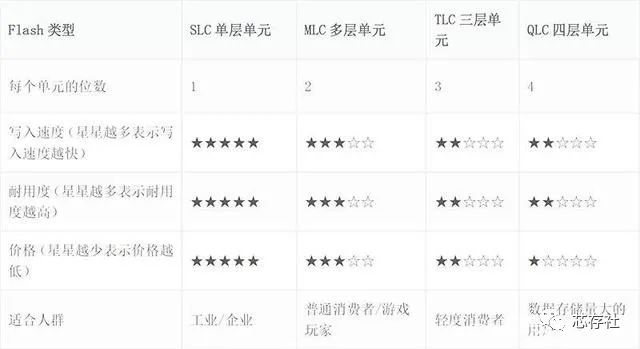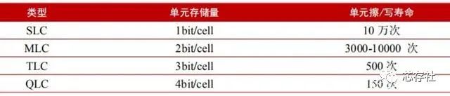 PS:每Cell单元存储数据越多,单位面积容量就越高,但同时导致不同电压状态越多,越难控制,所以导致颗粒稳定性越差,寿命低,各有利弊。